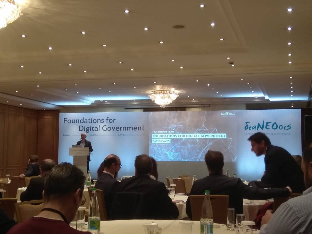 Τη Δευτέρα 18 Μαρτίου και την Τρίτη 19 Μαρτίου 2019 στην αίθουσα Ολυμπία της Αίγλης Ζαππείου διεργήθηκε με επιτυχία το πραγματικά ενδιαφέρον executive course που διοργάνωσε η διαΝΕΟσις σε συνέχεια του workshop για την Ηλεκτρονική Διακυβέρνηση, που πραγματοποιήθηκε την 1η Νοεμβρίου 2018 από τον επιστημονικό υπεύθυνο της αντίστοιχης έρευνας καθηγητή Διομήδη Σπινέλλη και την ομάδα του.